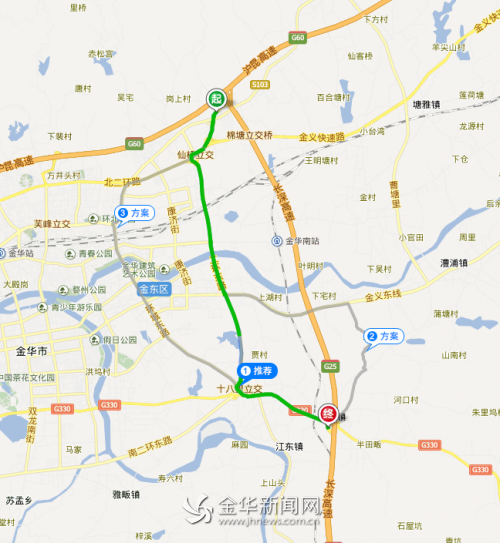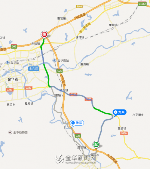 (金华东往温州方向分流)金华东———仙桥立交———二环东路———十八里立交———330国道———岭下朱。