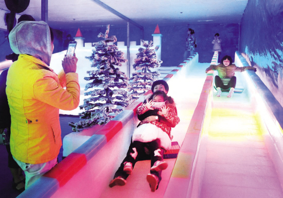 8月4号,在金东新城区光南路上,市民在零下7℃的室内冰雕展上玩冰雪滑道。据了解,该冰雕展于本月开始,集观赏、娱乐、互动、亲子等多功能于一体,冰雕作品不仅给市民在炎炎夏日带来一丝凉意,而且让大家领略到极地奇特的冰屋生活。