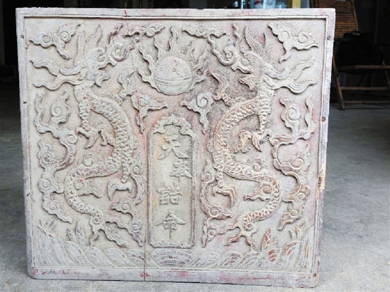但我们看到的并不是完整的盒子,只是几块散架的木板,其中一块还碎成两半。不过,木板上“奉天诰命”四字和雕刻的龙纹还非常清晰。