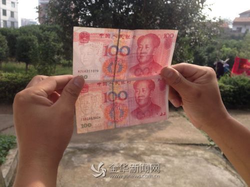 10月9日上午,记者来到金东区多湖街道黄泥山村周乾隆住处,瞧一瞧这张特殊的100元。见到记者,周乾隆从一本书中取出钱,他说这样能保存得好。在阳光下一照,水印里出现了叠影,多出来的头像虽然不是很清晰,但能看得出轮廓。