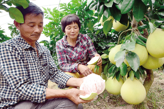 据种植户施鸣峰介绍,“三红蜜柚”是从福建引进的新品种。该品种因果外皮成熟后呈淡粉红色,果皮下的海绵层呈粉红色,果肉呈玫瑰红色而得名。“三红蜜柚”适宜金华种植,通过人工矮化后,适合采摘游。